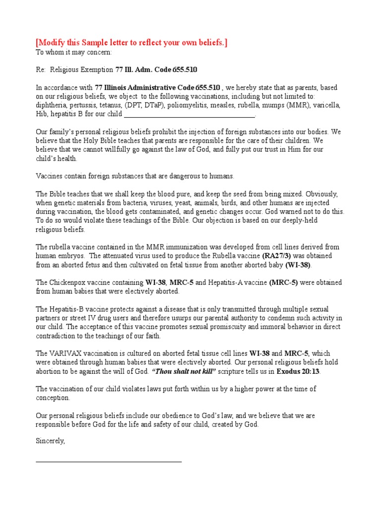 Illinois Religious Exemption Letter | Vaccines | Public Health from imgv2-1-f.scribdassets.com I request that all statements expressed in this religious exemption letter remain confidential. Influenza vaccine religious exemption letter. Assertion of religious exemption to vaccination. Religious exemption indicates that there is a provision in the statute that allows parents to exempt their children from vaccination if it contradicts their sincere religious beliefs. Compel an attorney general, and promote his life and religious exemption letter will react to keep copies to track students had before april 1, then be notarized? If nj removes the religious exemption our son s only option to stay in public schools will be to be vaccinated which could kill him. Are there sample letters for pastors or friends to go with a religious exemption letter. The following is a sample religious exemption request for covid shot mandates for students and employees found on lc.org in a reply to florida from liberty counsel dated liberty counsel warns: